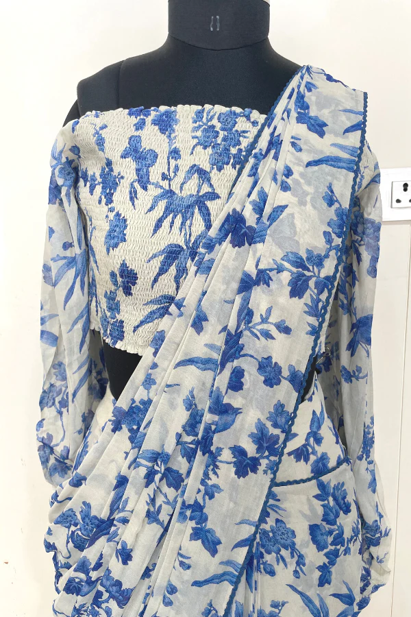 Blue floral printed pre stitched saree