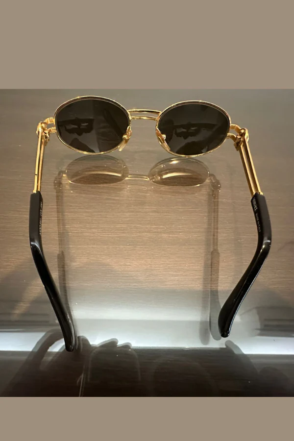 Description: A statement pair of vintage Gianni Versace sunglasses featuring bold gold-tone frames with signature Medusa medallion detailing on the temples. Designed with oval dark lenses and black acetate arms, this luxurious accessory exudes timeless elegance and iconic 90s style.