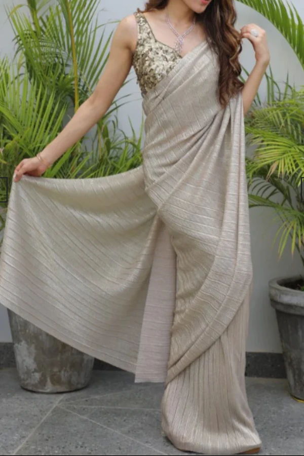 This elegant metallic pleated saree effortlessly combines modern sophistication with timeless charm. The subtle shimmer fabric drapes beautifully, creating a fluid silhouette that flatters every body type. Styled here with a sequin-embellished blouse, it adds a touch of glamour perfect for evening events. Pair it with statement earrings, sleek heels, and a clutch for a refined cocktail look or festive celebration. Ideal for receptions, cocktail parties, festive gatherings, or contemporary weddings.