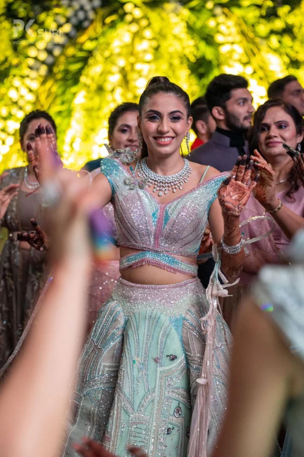 Sulakshana Monga designs a lehenga out from a fairy tale! A light pink and blue glamourous lehenga inspired by butterflies. The lehenga has a beautiful structure. It has an off-shoulder blouse with an interesting dupatta.